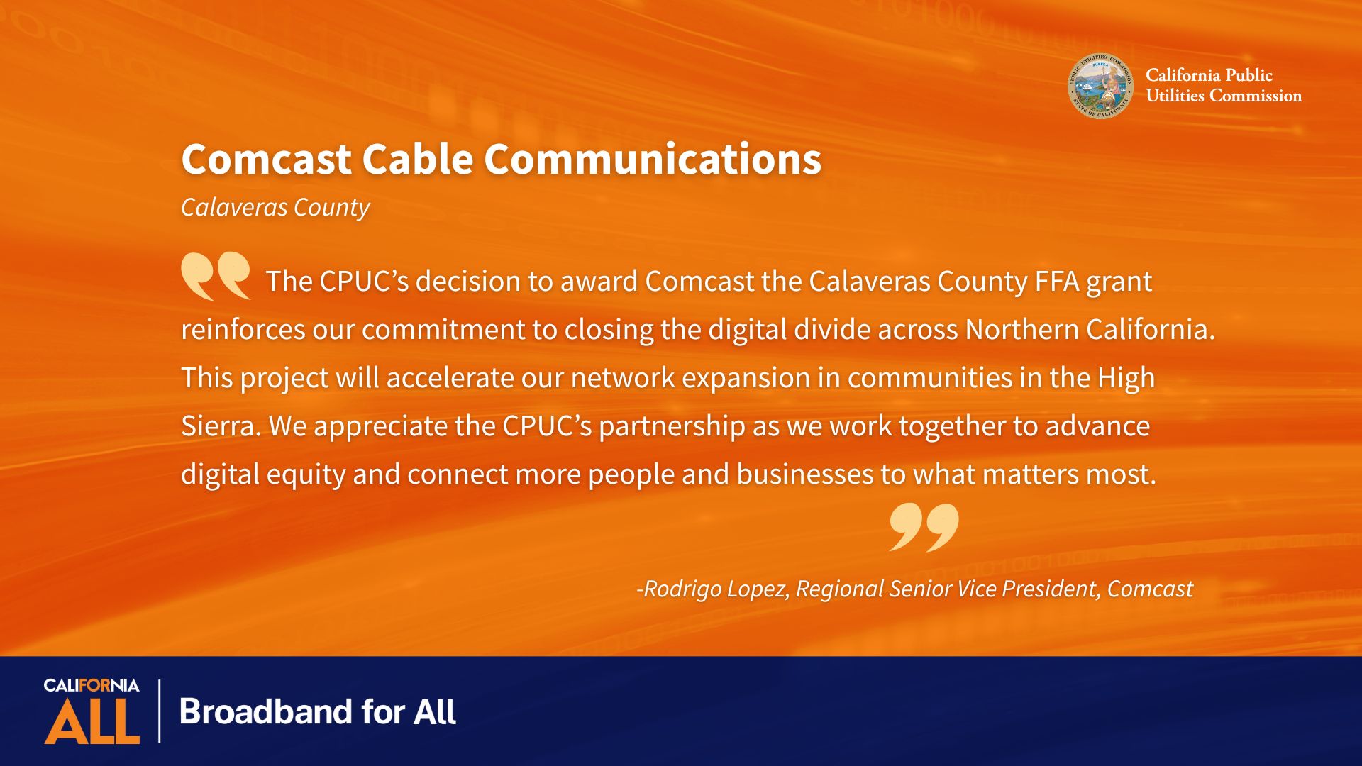 These investments are part of California’s ongoing Broadband For All effort, bringing affordable, fast internet to households, schools, and small businesses that have long been left behind. The projects will serve nearly 15,000Californians and connect more than 4,500 previously unserved locations across Calaveras, Orange, and Trinity Counties, as well as multi-county partnerships in Humboldt and Los Angeles Counties.